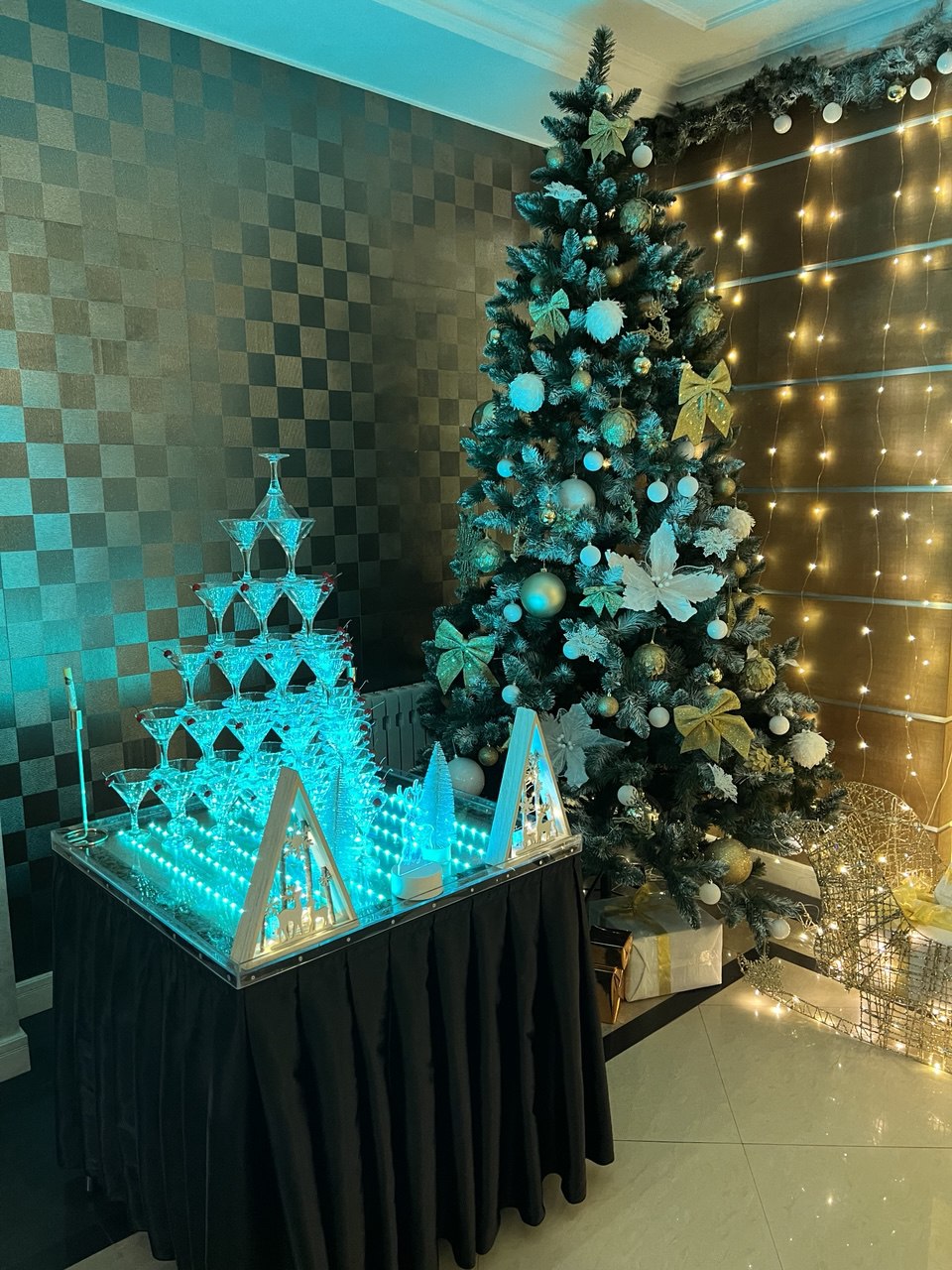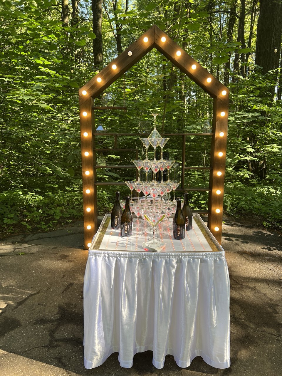 Очень изящное и зрелищное украшение вечера – Пирамида Шампанского. Используется в качестве приветствия гостей, когда шампанское с самого верхнего бокала красивым каскадом переливается в нижние бокалы под аплодисменты публики. Пирамиду шампанского можно составить из 35, 56 и 84 бокалов.